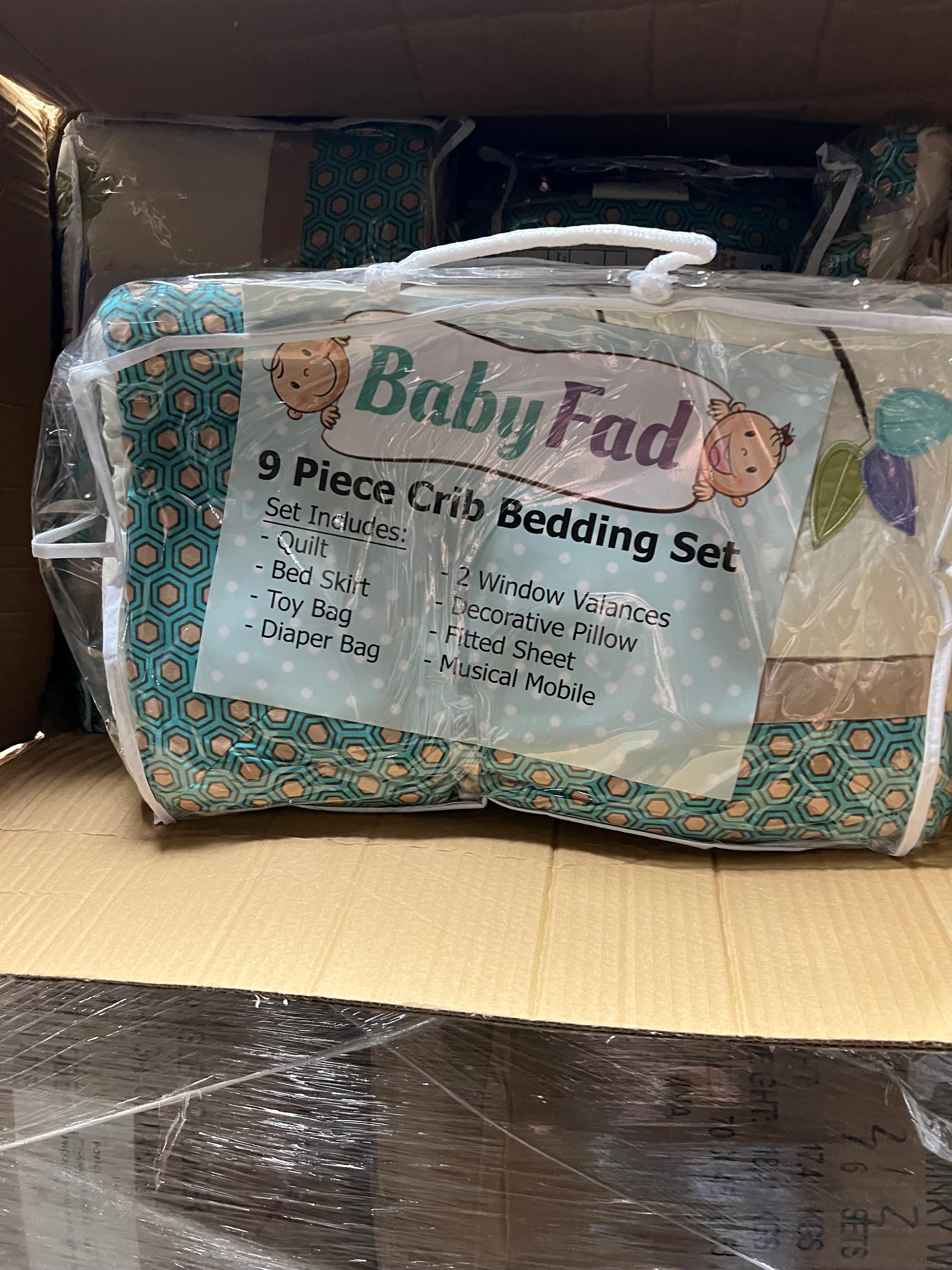 - Each 9 piece baby bedding includes a quilt, fitted sheet, bed skirt, 2 window valances, toy bag, diaper stacker, decorative pillow and a matching musical mobile